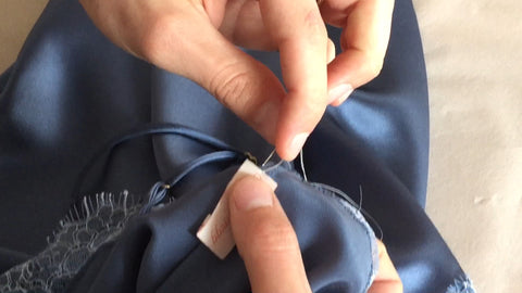 Once pinned, the lace is carefully sewed on the silk, with very tiny zigzag stiches.